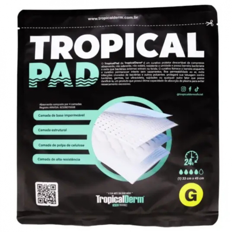 O TropicalPad da TropicamDerm é um curativo protetor descartável de compressa absorvente, não aderente, não estéril, resistente a umidade e possui barreira bacteriana que evita que bactérias externas entrem na ferida. O curativo fornece a barreira enquanto o curativo permanecer intacto sem vazamentos.